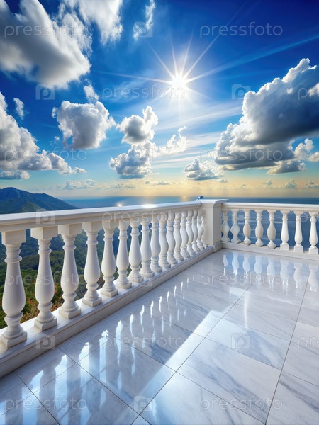 Белый мраморный балкон с видом на солнечное небо и далекие горы