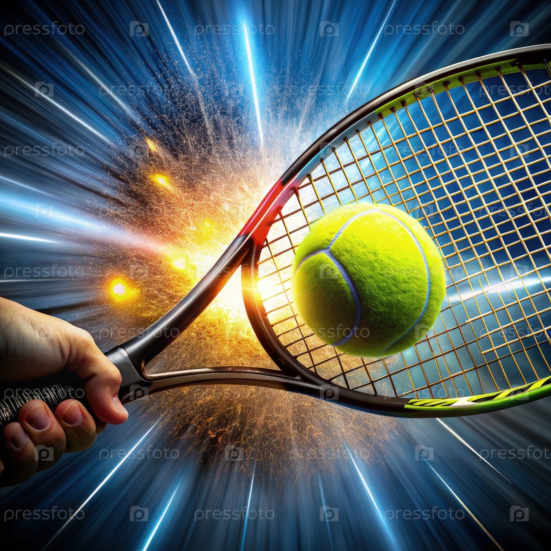Рука, держащая теннисную ракетку, бьет мяч против размытого фона световых полос