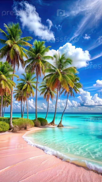 Пальмовые деревья затеняют розовый песчаный пляж в солнечный день