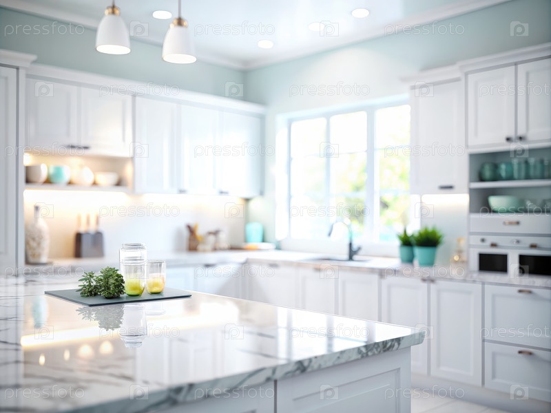 Размытый вид современной белой кухни с мраморным островом