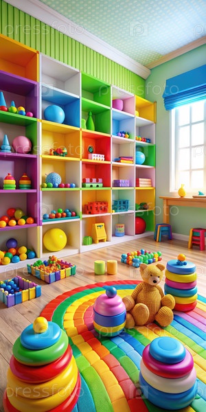 Красочная игровая комната с радужным ковром и игрушками для складирования