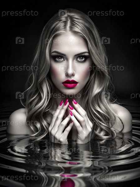 Монохроматический портрет женщины с розовыми губами и ногтями, погруженными в воду