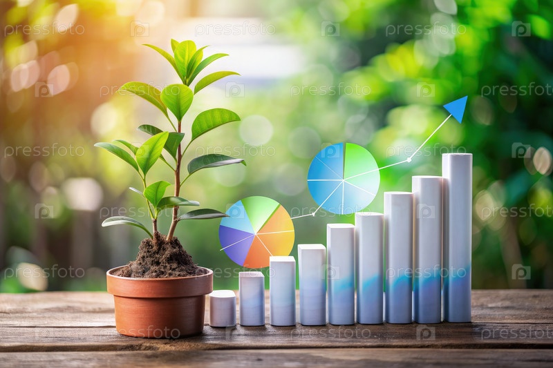 Небольшое растение растет рядом с восходящим штрих-графом и пирожными диаграммами в естественной обстановке