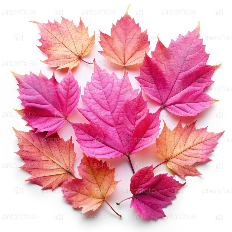 Розовые и оранжевые осенние листья расположены на белом фоне