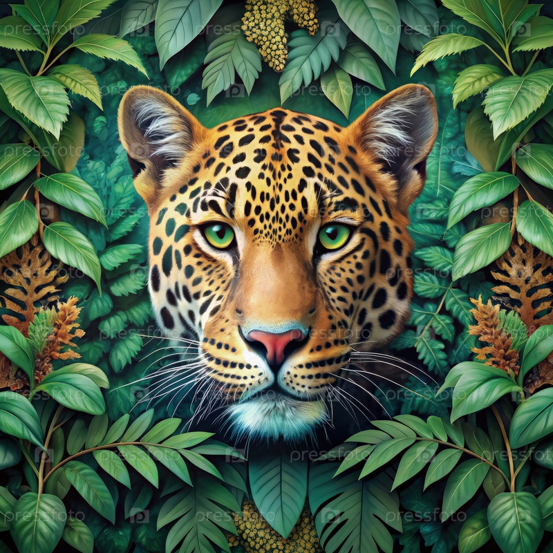 Лицо леопарда обрамлено пышными зелеными листьями