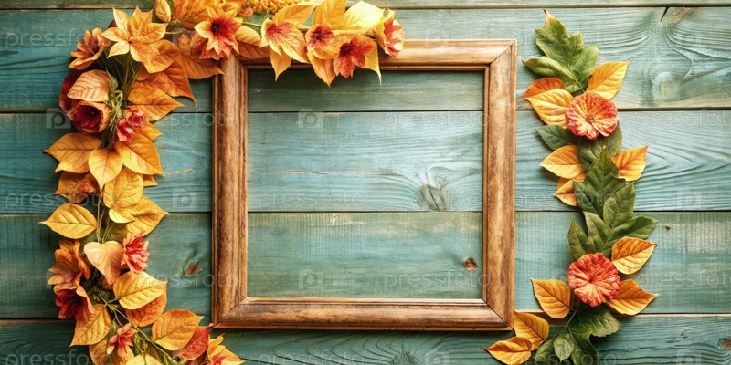 Осенний венок и осенняя картинная рама на фоне деревянной доски