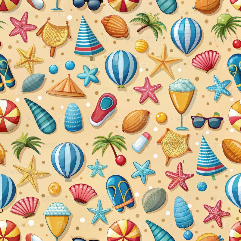 Пляжный летний веселый бесшовный шаблон с красочными пляжными объектами. генеративная ИИ