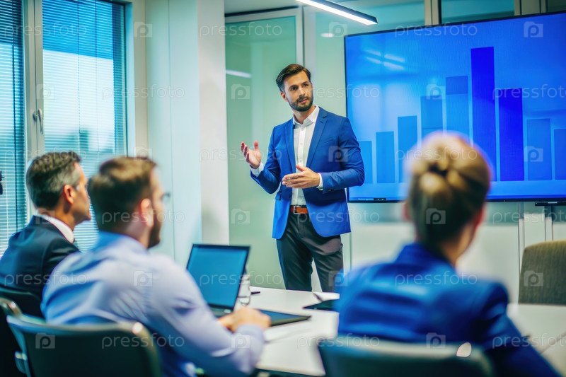 Бизнесмен дает презентацию с информацией, основанной на данных в современном офисном конференц-зале