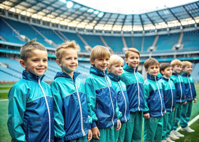 Молодые члены спортивной команды в совпадении с ветряками стоят на стадионе