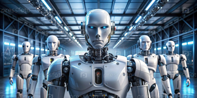 Ряд гуманоидных роботов, стоящих на современной фабрике
