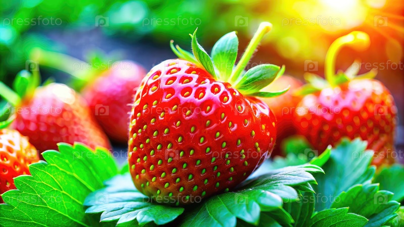 Близкий план спелой клубники в саду. генеративный ИИ