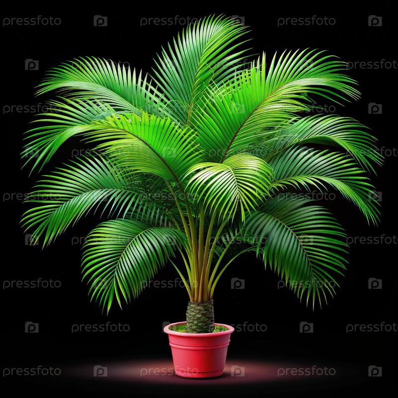 Плодородное зеленое пальмовое дерево в красном горшке на черном фоне