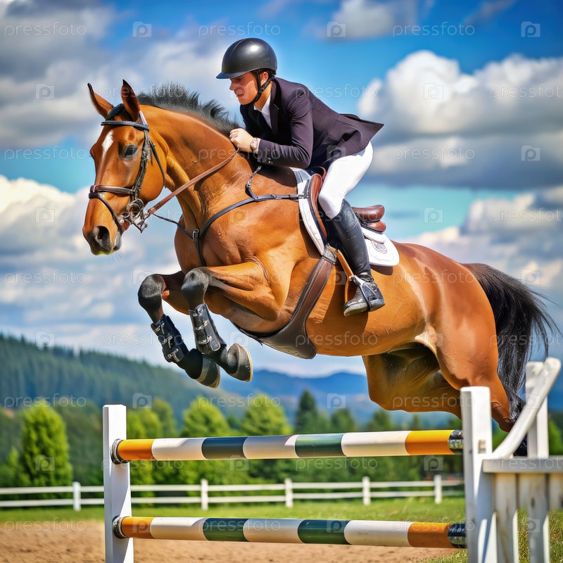 Конный скачок через стандартный забор в солнечный день