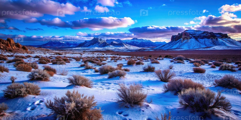 Снежный ландшафт пустыни с горным хребтом и облачным небом