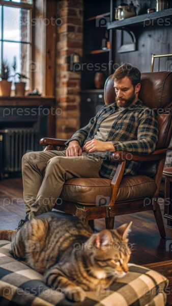 Человек, отдыхающий в кожаном кресле с котом на стуле