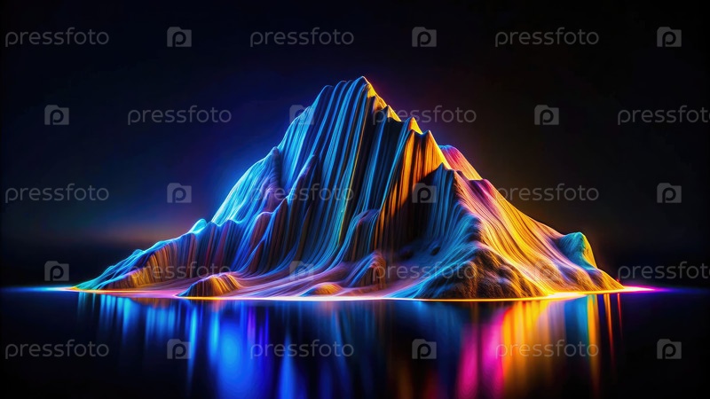 Освещенный горный пик, отражающийся в неподвижной воде ночью