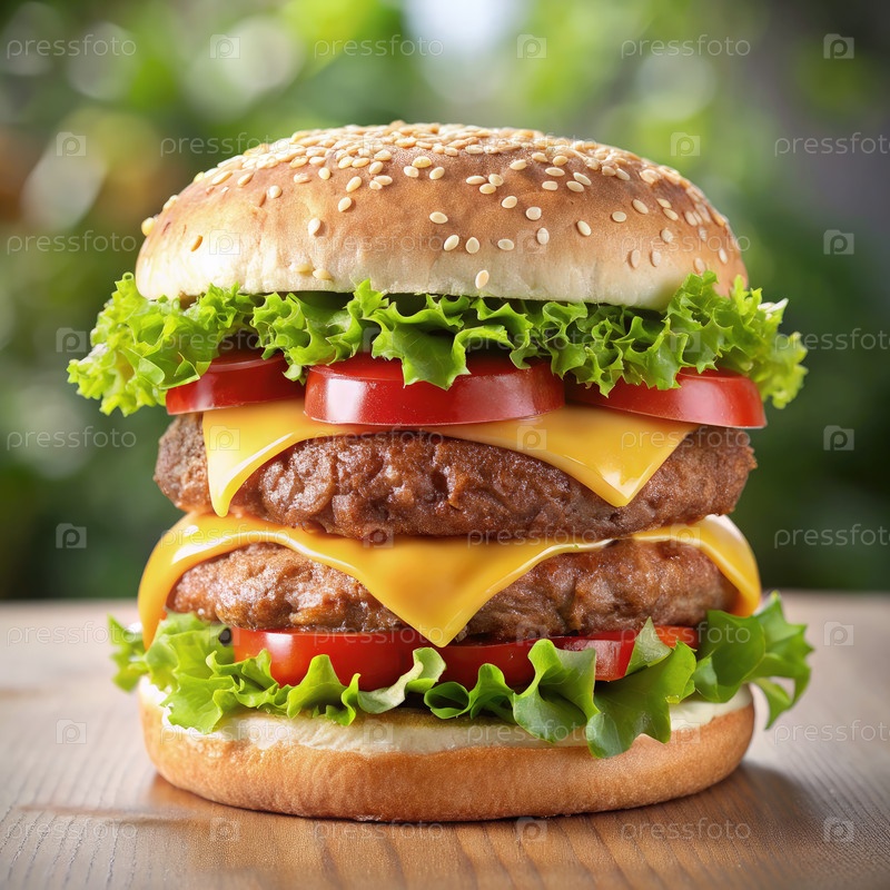 Double Patty Cheeseburger на деревянном столе с зеленым фоном