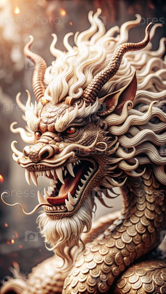 Близкий план величественной статуи китайского дракона с яростным выражением лица