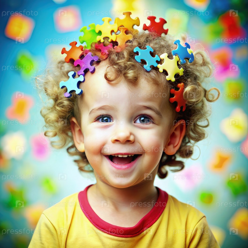 Маленький ребенок с кудрявыми волосами, носящий красочные фрагменты головоломок, ярко улыбается