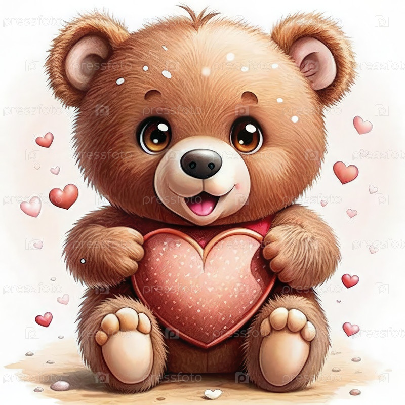 Милый коричневый медведь держит сердце на белом фоне в День святого Валентина