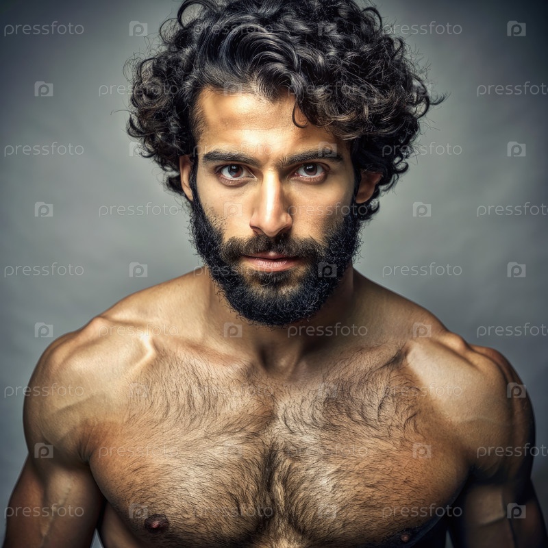 Близкий портрет мускулистого мужчины с кудрявыми черными волосами и бородой