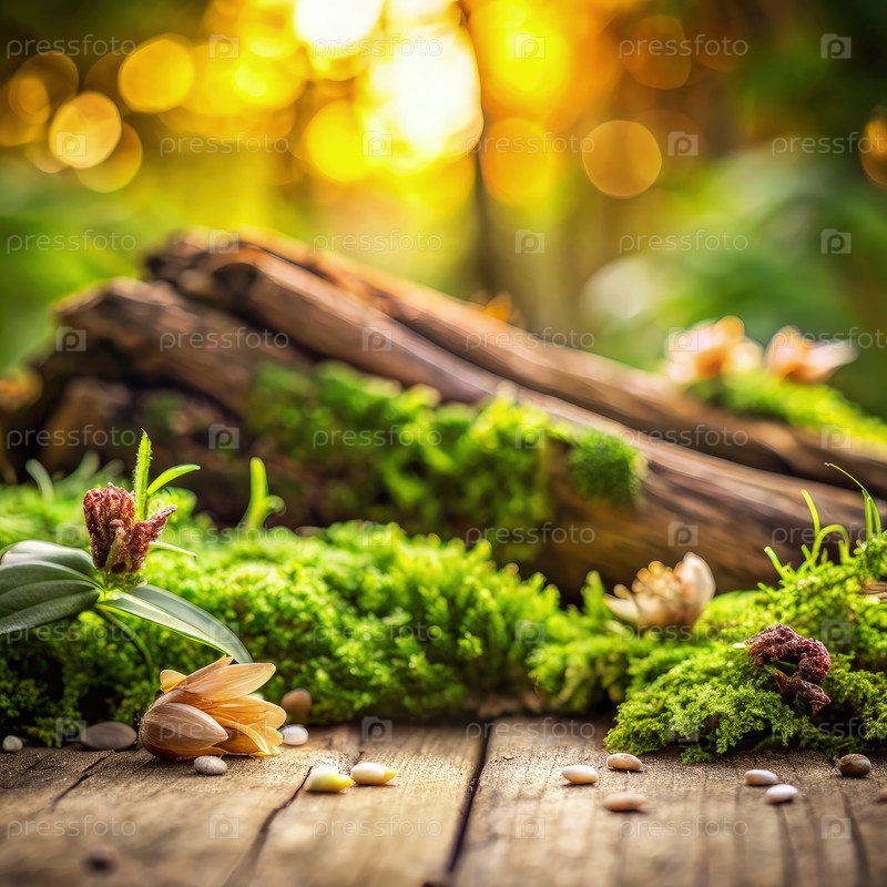 Роскошный зеленый мох, древесина и цветы в лесной обстановке на закате