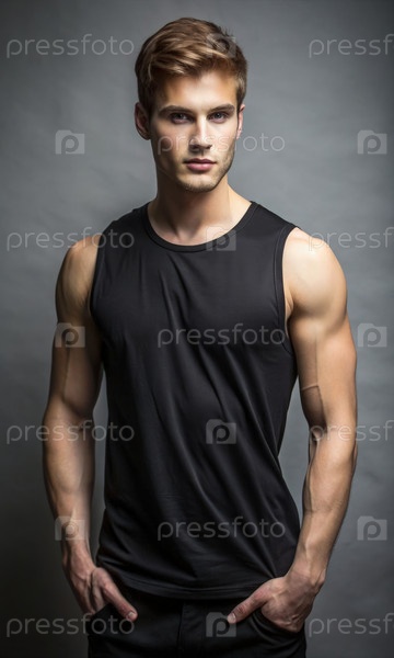 Молодой человек позирует в черном танковом топе на сером фоне