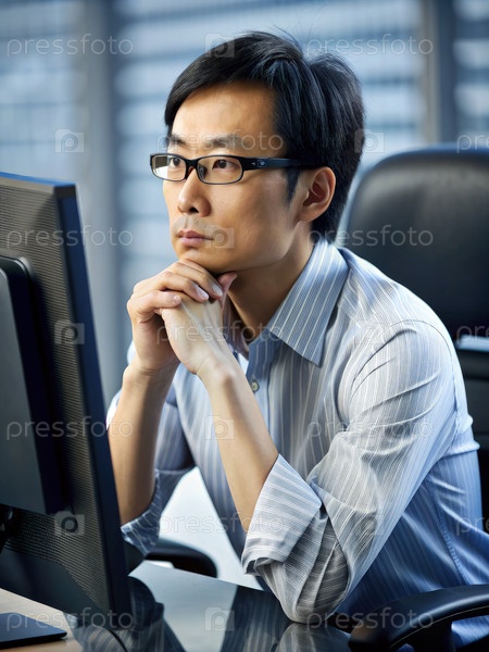 Бизнесмен на офисном сиденье, глубоко в мыслях, смотрит на компьютерный экран
