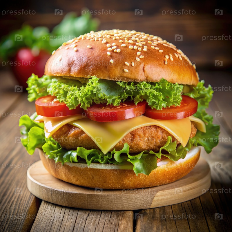 Близкий план сочного куриного бургера с салатами, помидорами и сыром на деревянной режущей доске
