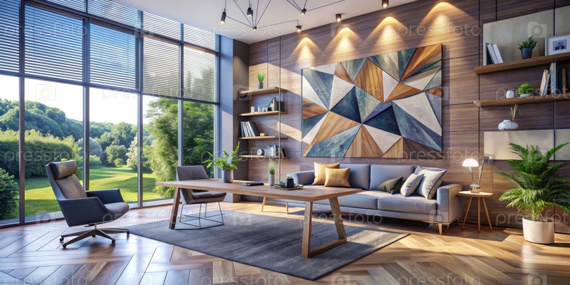 Жилая комната с большими геометрическими рисунками и естественным светом