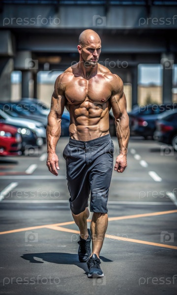 Бодибилдер без рубашки, прогуливающийся по парковочной площадке в солнечный день