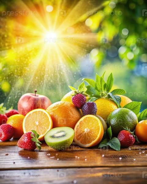 Аранжировка свежих фруктов на деревянном столе с солнечными лучами