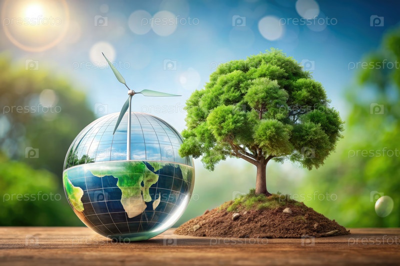 Ветряная турбина и деревья стоят на страже над стеклянным глобусом Земли