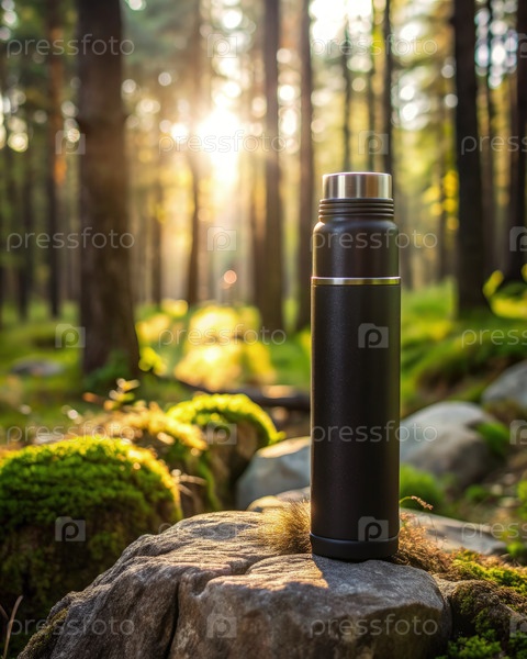 Черный термос, отдыхающий на камне в лесу при закате солнца