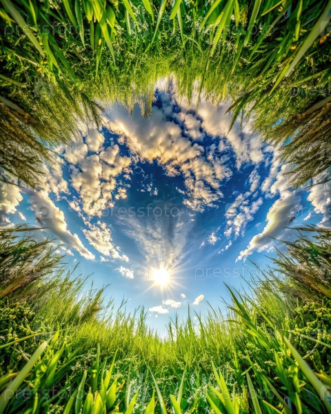 Зеленая трава обрисовывает яркий зеленый солнечный день с облаками