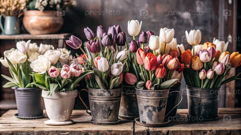 Винтажная ботаническая иллюстрация красочных тюльпанов в деревенских металлических горшках. генеративный AI
