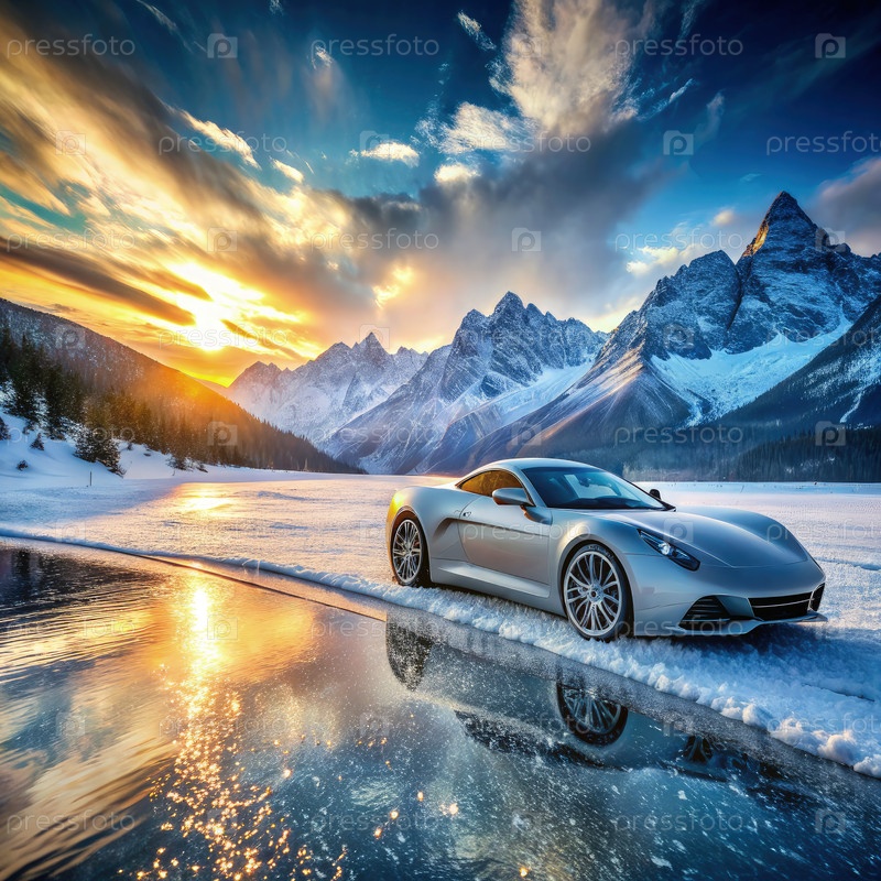 Серебряный спортивный автомобиль на замороженном озере при закате солнца в горах