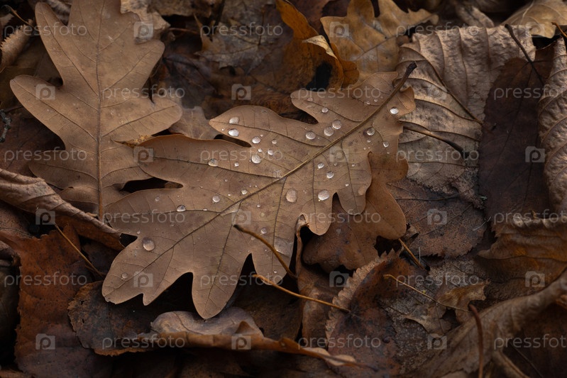 Осенние листья дуба с каплями