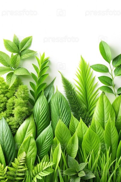 Живые зеленые листья и трава на белом фоне