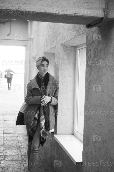 Молодая красивая женщина позирует в сером пальто снаружи