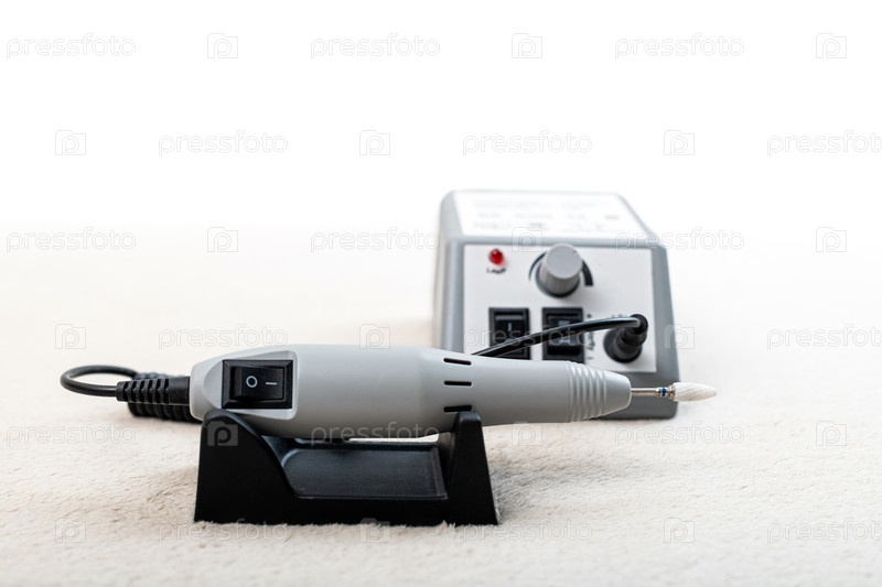 Электрическая ногтевая дрель и блок управления на белом фоне.Маникюрное оборудование для педикюра в студии красоты