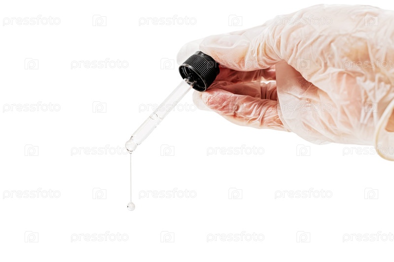 Рука в медицинской перчатке с стеклянной пипетой, из которой выпадает жидкость. Научный эксперимент и медицинские исследования. Применение косметологии