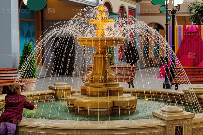 Маленькая девочка смотрит на декоративный фонтан в торговом центре. Ребенок, очарованный течением водного потока в закрытом общественном пространстве. Архитектурное искусство и концепция городского досуга