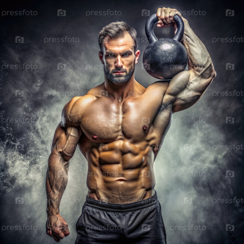 Мускулистый мужчина держит тяжелый кеттлебелл в драматической студийной обстановке