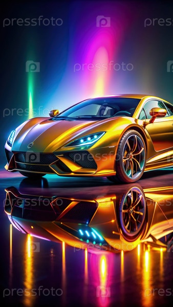 Золотой спортивный автомобиль отражается в неоновых огнях ночью