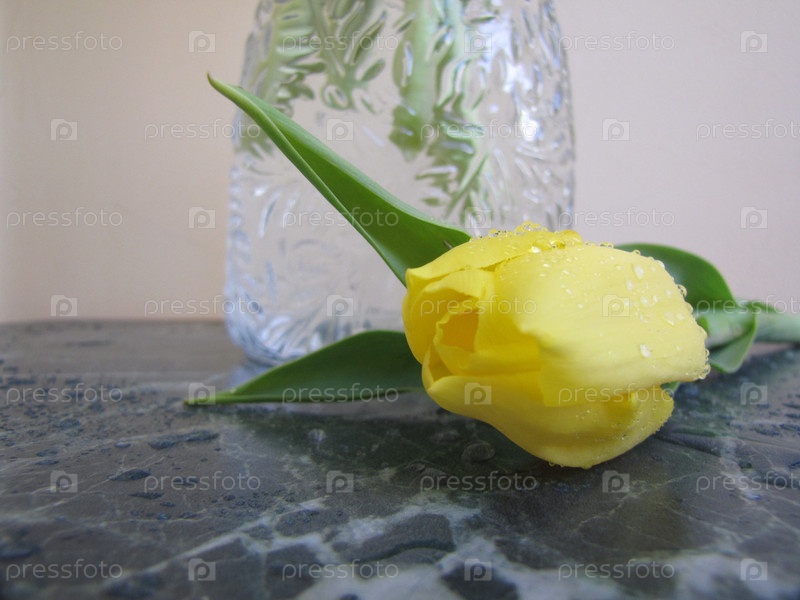 Желтый тюльпан с каплями воды на мраморном фоне