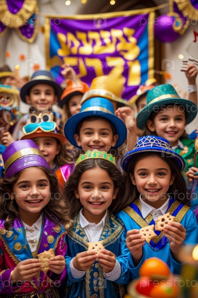 ИИ генеративные еврейские дети в карнавальных костюмах, празднующие традиционный еврейский праздник Пурим в Израиле