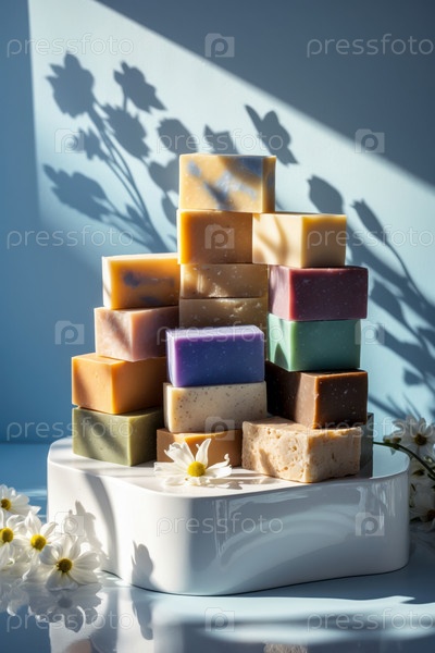 AI Generative Bar piece natural organic aromatic cosmetic handmade soap на стенде на синем фоне