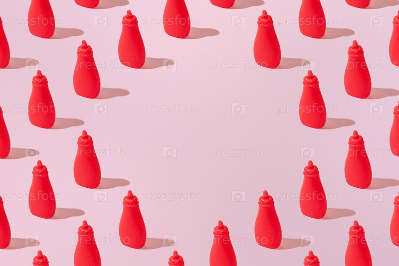 Креативный рисунок томатного кетчупа плоский лежит на пастельном розовом фоне