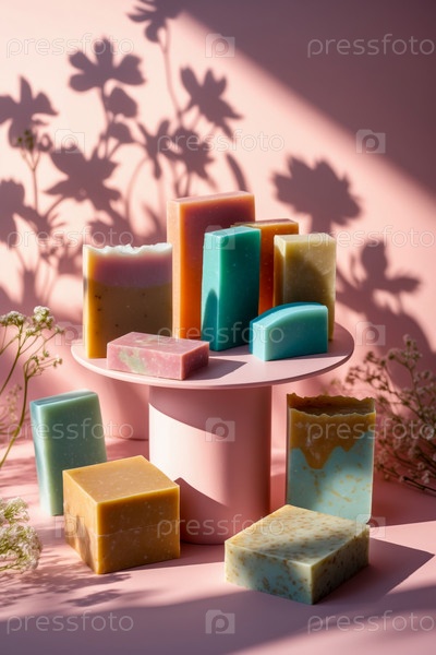 AI Generative Bar piece natural organic aromatic cosmetic handmade soap на стенде на розовом фоне
